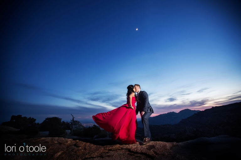 I knew that I wanted to escape the heat as we settled down into summertime in Arizona. And Farrah and Dane knew exactly what I was thinking when I suggested we go up to Mount Lemmon for their summertime engagement photos! There is something very soothing about strolling through the nice 70 degree cool woods when its 100 down in the valley just below. As the sun dipped lower, we headed for the views and rocks and a windy sunset that spun Farrah’s dress around in a beautiful whirl of red while the skies turned purple, crimson and then dark blue behind us.