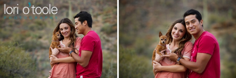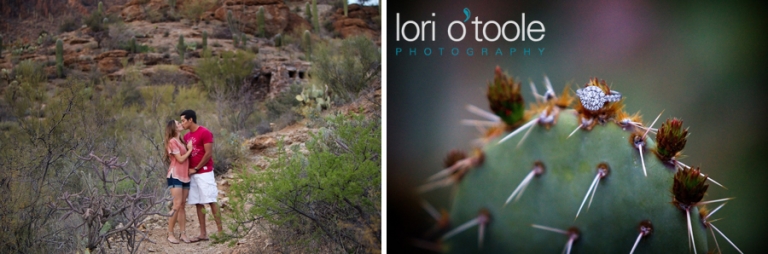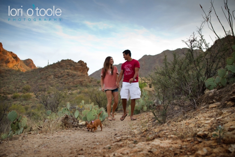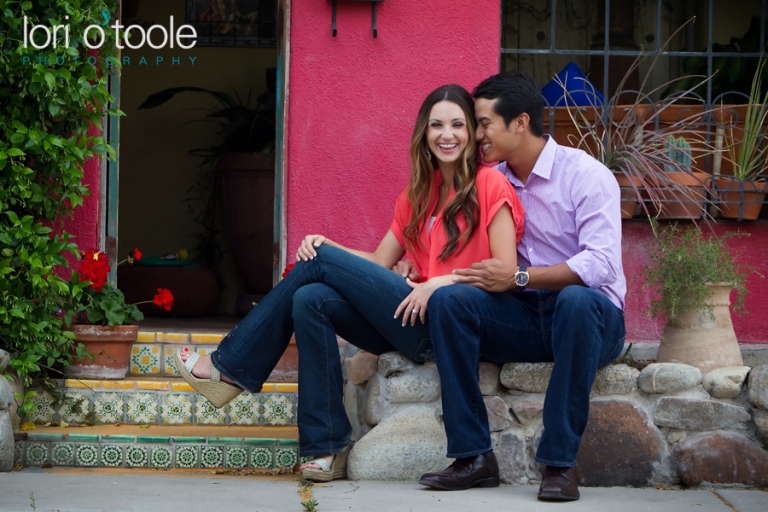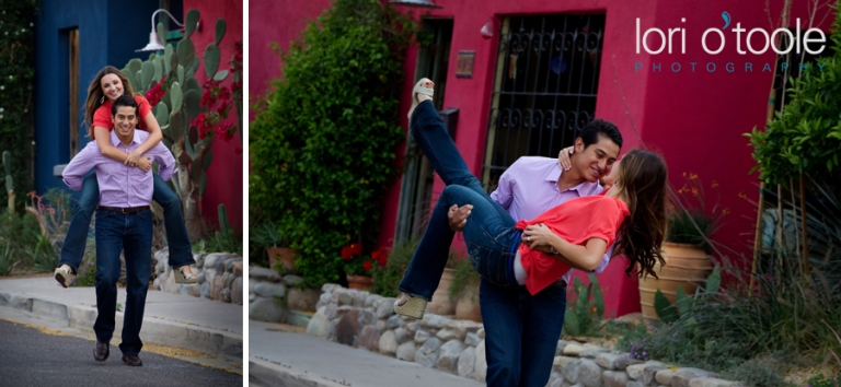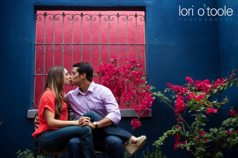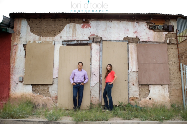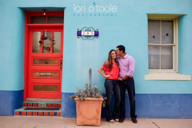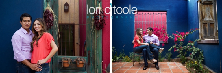 Abby and Ben grew up just a few miles apart from each other in Nogales, but they never met until years later.  Instant attraction, and now a wedding this summer.  They had booked me sight unseen to photograph their wedding, but thought an engagement shoot would be a great way to intro ourselves.  And it was :).  We decided to meet up downtown at El Charro and head into the barrio.  (you’ll spot me right away – I’ll be small person carrying a very large camera)   Like a blind date, I’m all nervous – Will I like them?  I hope we click….will they like me?  I always start off with a few standard things to warm people up and get a feel for who they are as a couple.  I’d say it took a whole maybe 3  minutes for us to find a groove and then it stopped being work and started being fun!  Abby and Ben are attracted to bright colors so we were in the perfect place.   And thank you to the very nice man (I am so sorry to say I forgot your name 30 minutes later – I really should have written it down.  But thank you for letting us crash your courtyard.  It was painted the most wonderful happy blue and the bougainvillea was a stunning pink against that blue background.  Your courtyard made me want to come back and sit there every day – I am leaving you a bottle of wine as a thank you the next time I drop by…