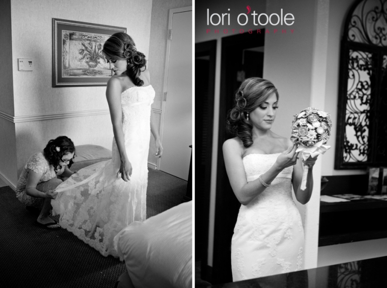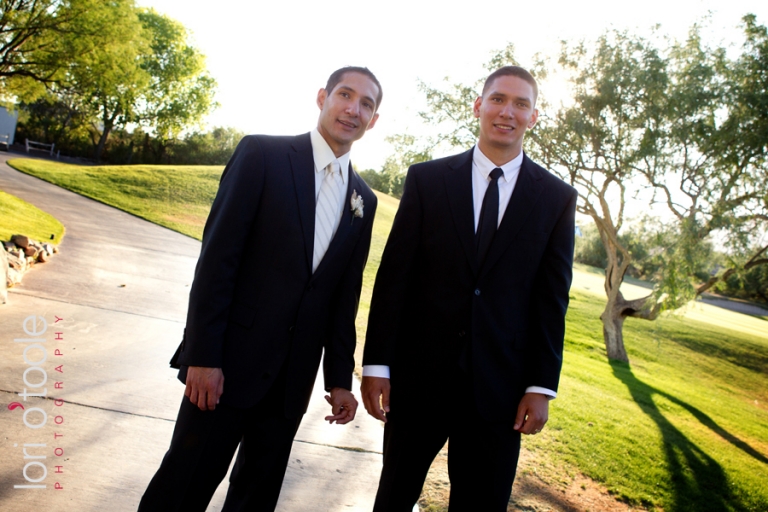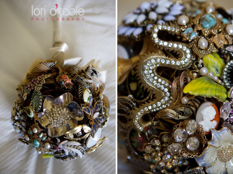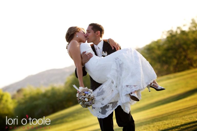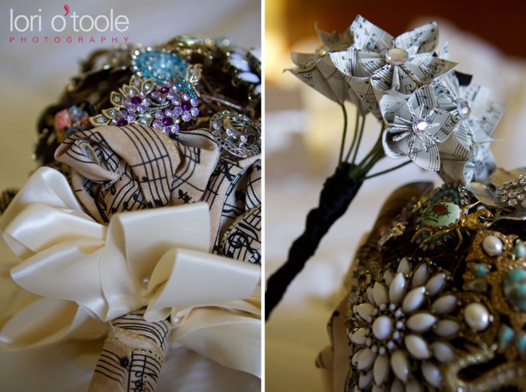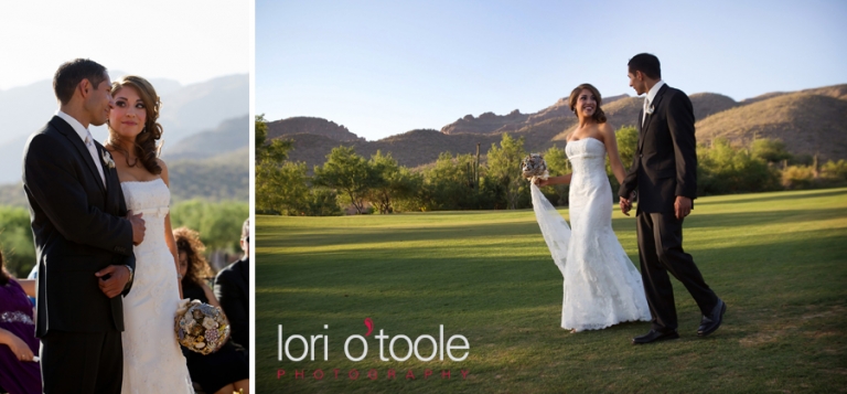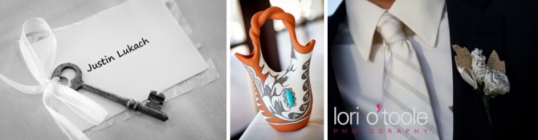 Skeleton keys, a brooch bouquet, music sheet paper, individual wedding cakes on each table, a North American wedding vase……Elizabeth and Michael’s wedding at the Arizona National Golf Club in Tucson brought together some gorgeous and unusual details. I have never seen a bouquet made of brooches before – this unique and unusual wedding bouquet was stunning! Elizabeth asked family members to collect brooches for her wedding bouquet – some of the brooches had been family heirlooms for a very long time. Musical notes decorated the ribbons around the bouquet and the groom’s boutonniere and maid of honor’s bouquet were made from sheets of music. Elizabeth and Michael sharing a drink from a Native American wedding vase was the final touch to their beautiful outdoor ceremony, after which we all jumped on golf carts and headed up to the 14th hole to take some photos and enjoy the gorgeous views of Tucson!